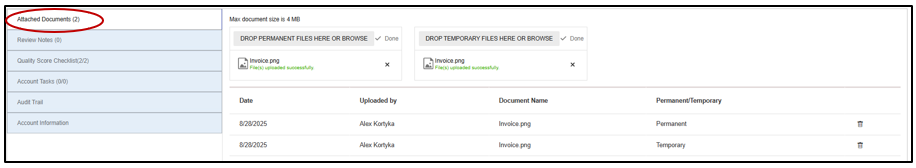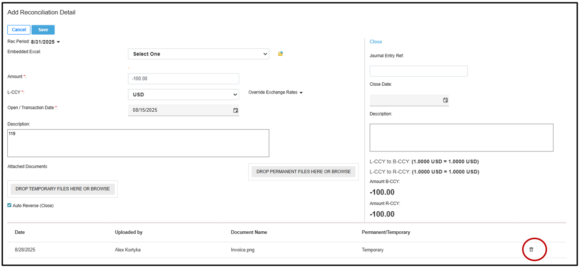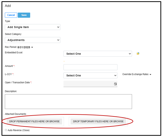 •Within the rec form details, once a line item is created in the reconciliation form, Preparers (and Back up Preparers) may click directly onto line item to attach documents.