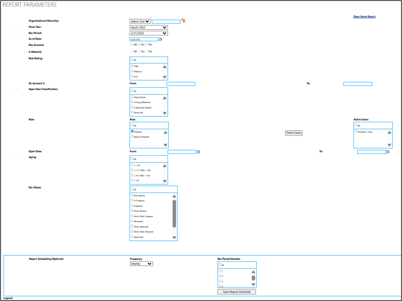 Open Items can be managed and tracked by risk rating, type of exception (adjustments, timing differences, write-offs, etc.), by role/user, by aging timeline and by status of the reconciliation. See the parameters and example of report below: