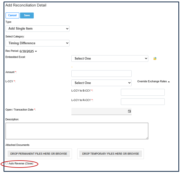 When directly inputting information for a reconciling item in a reconciliation, a checkbox can be checked to indicate that an item should be automatically reversed (see SS A) or it can be left unchecked to indicate that an item should not be automatically reversed in the next period..