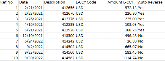 When importing reconciling items into a reconciliation, a 'Yes' or a 'No' must be entered in the column labeled 'Auto Reverse' (see SS B). A 'Yes' in the 'Auto Reverse' column indicates that that rec item should be automatically reversed in the next period while a 'No' in that column indicates that that rec items should not be automatically reversed in the next period.