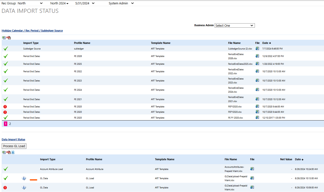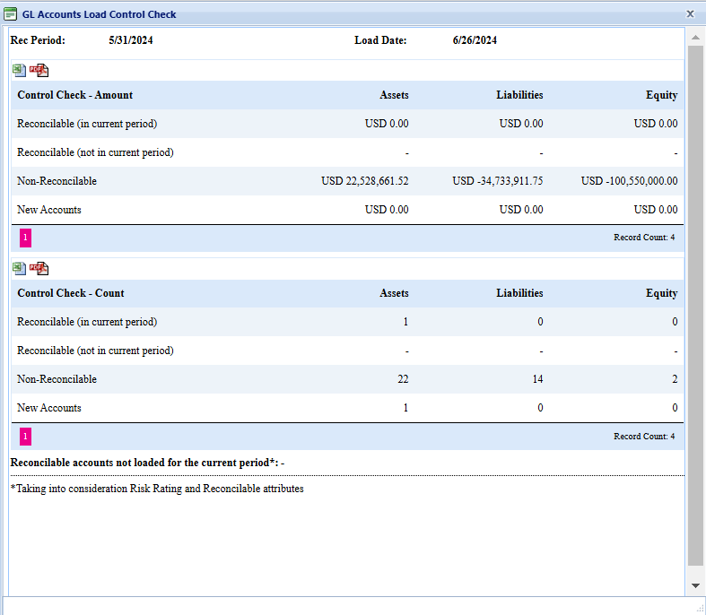 Note that if the import is in a warning or error state, the pop up window will not display anything. But upon a successful GL upload, the GL Accounts Load Control Check window will display amounts and counts for the current rec period and the import load date selected.