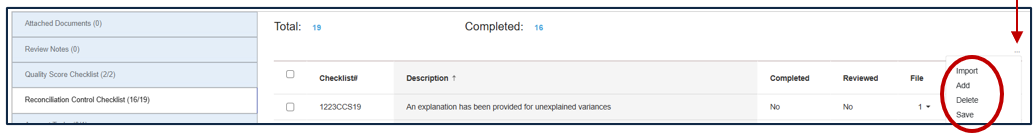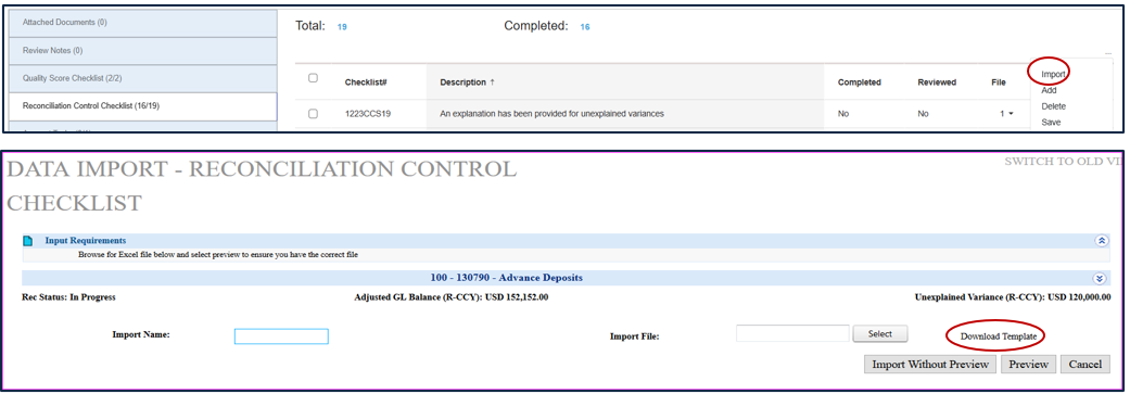 •If desired, the System Admin, Business Admin and/or Preparer may also mass upload a list of checklist items by clicking “Import” in the Reconciliation Control Checklist section and downloading and completing the template.