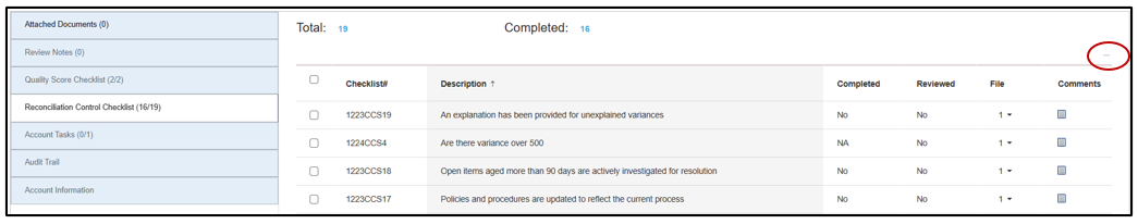 •Checklist items created by the System Admin cannot be modified or deleted. However, as long as the reconciliation is in the Not Started stage, Preparers may also add their own checklist items by clicking the 3 dots.