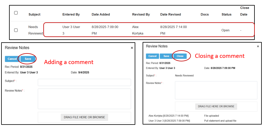 Review notes can be closed out by the Reviewer after creation by clicking on the notes. Reviewer may click on “Close” button after note has been cleared. The status of the note will be displayed.